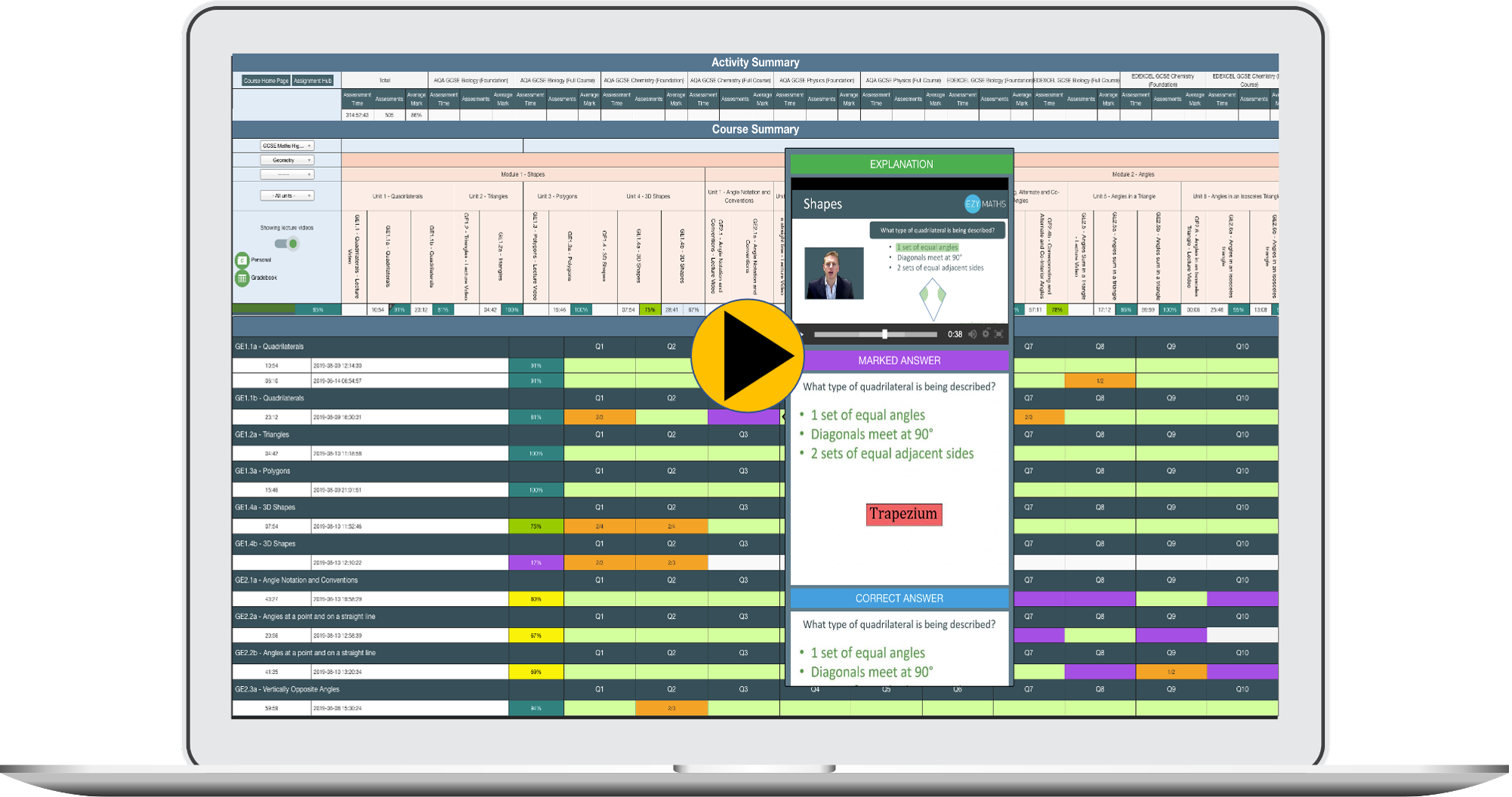Users also have a personalised gradebook with dynamic question level analysis backed by single touch/click access to images of every marked question attempt and an explanation.
