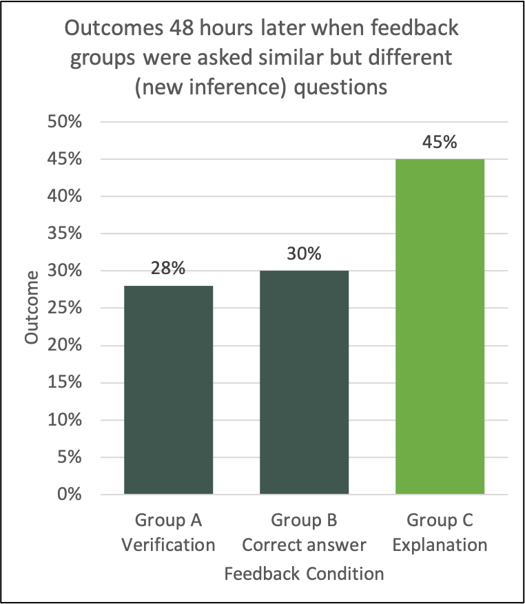 In the referenced research three groups of students completed an online physiology assessment. Each group received different forms of feedback – no feedback, correct answer or explanation. The students were tested again two days later with 50% of the questions repeated and 50% new inference questions (similar subject focus but producing a different answer).