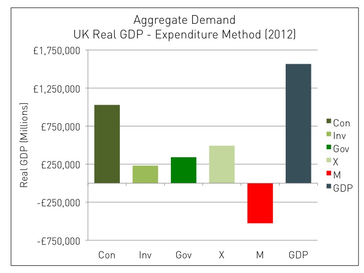 The actual level of AD is analysed using the aggregate demand curve and measured via the real GDP expenditure method. This graph details the outcome in 2012: