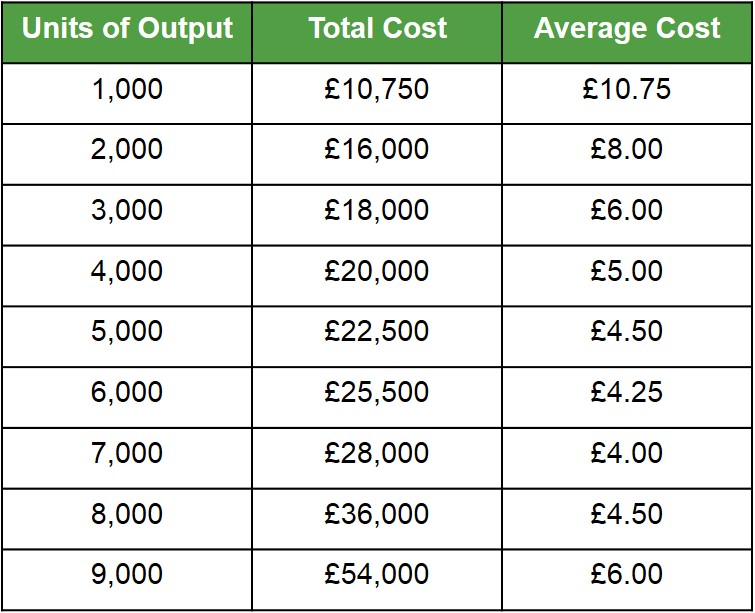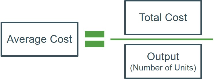 The cost per unit of output. This is calculated by total cost divided by units of output. The table below shows the calculation of the average cost per unit for a firm for different levels of output and costs.