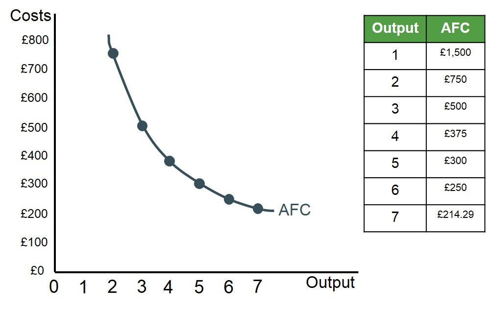Below is an illustrated example of how to calculate the AFC for different levels of output for a hypothetical firm. These points can then be used to map out the AFC curve for this firm.