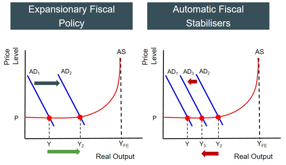 For instance, if the government runs an expansionary fiscal policy, this should theoretically increase aggregate demand quite significantly as a result of the government spending component of AD increasing or higher consumption brought on by higher disposable income (Y-T). But taking into account the role of automatic fiscal stabilisers, the expansion in AD (upside in growth of output, employment and the price level) from this type of fiscal policy will be constrained and the aggregate demand curve shift may not be as significant i.e. shifts to ADrather than AD2.