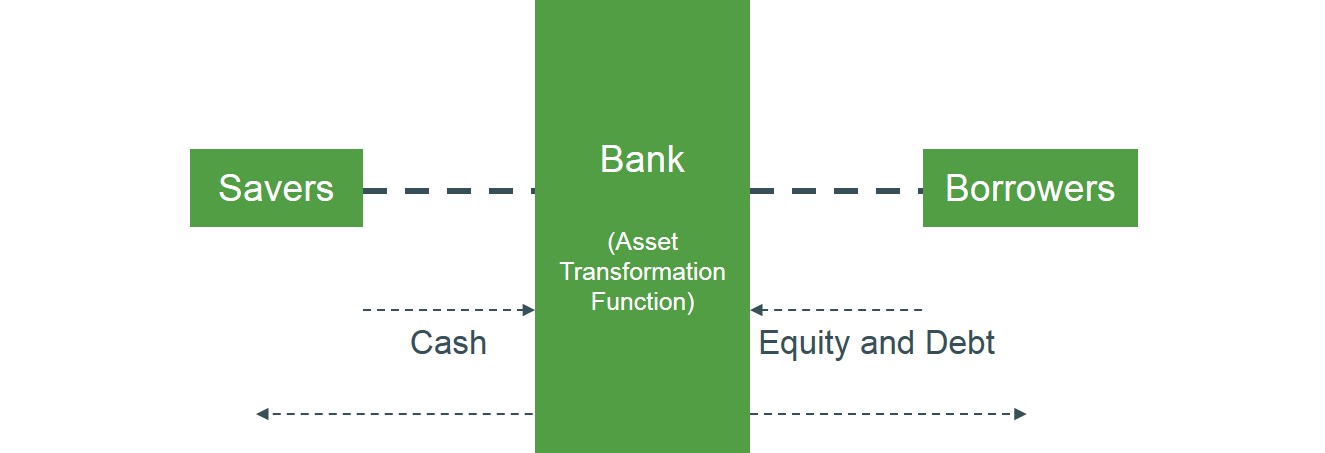 The diagram below illustrates how banks take cash from savers (surplus units - total income exceeds total expenditure) and the bank issues it off to borrowers (deficit units - total income exceeded by total expenditure) through loans in exchange for their debt (to be paid back at a later date).