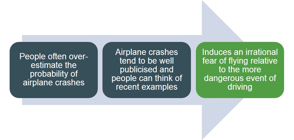 This is a cognitive bias as individuals tend to over-estimate the probability of an event occuring the more easily they can recall examples. For instance to put this bias to the test in an experimient individuals were asked to state which of the two options was more likely 'words beginning with k' or 'words where the third letter is k'. Most individuals wrongfully chose the former option as it is much easier to recall words that start with the letter k than it is with words where the thrid letter is k. Another example of this is to ask individuals to evaluate the probability of an airplane crash as the diagram below shows.