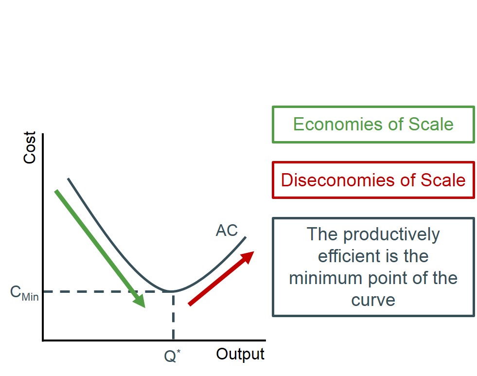 Below is a diagram to illustrate the basic shape of the average cost curve. The section of the graph in which average costs are falling is when the firm is experiencing economies of scale and the red section of the graph is when the firm is experiencing diseconomies of scale. Therefore as the graph illustrates firms should be aiming to produce at the quantity that yields the minimum of this u-shaped curve i.e. producing too much leads to excess costs, inefficiency and diseconomies of scale.