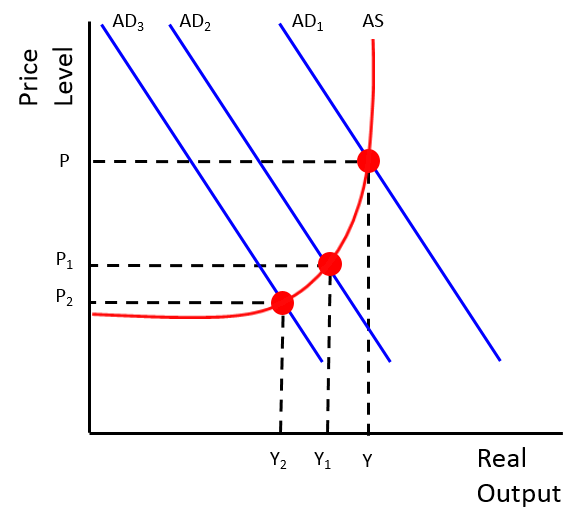 On the other hand, if the government runs a contractionary fiscal policy, this should theoretically decrease aggregate demand quite significantly as a result of the government spending component of AD decreasing or lower consumption brought on by lower disposable income (Y-T). But taking into account the role of automatic fiscal stabilisers, the contraction in AD (downside in reduction of output, employment and the price level) from this type of fiscal policy will be constrained and the aggregate demand curve shift may not be as significant i.e. shifts to ADrather than AD2.