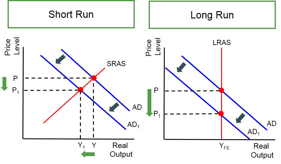 Below is a graph to breakdown the economic effects of a government running a contractionary fiscal policy in an AD/AS framework. This can be achieved through raising taxes, decreasing government expenditure or possibly both from the classical viewpoint. The immediate impact is that the AD curve shifts inwards creating a decelerating inflation rate.