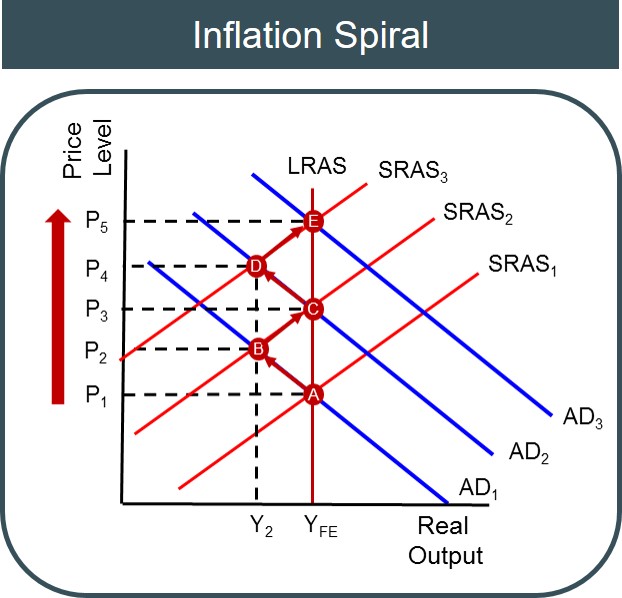 Cost push inflation can also lead to more severe changes in the price level if it is part of an inflationary spiral as shown below. This is created originally because of an increase in production costs moving the economy below the full employment and moving the economy to point B, as before. However, the rising costs of production can boost the disposable incomes of the owners of the factors of production (particularly if brought about by higher wages) which can result in an increase in spending and economic activity assuming ceteris paribus (depending on the marginal propensity to consume and save). This causes the AD curve to expand and moves the economy back to the full employment output level at point C. Crucially though, this leads to further inflationary pressures as the price level has now increased to P3. The spiral can then continue because if prices in the economy are increasing quickly, workers will bargain for higher wages to ensure in real terms they are made no worse off. This further increase in production costs for firms forces the SRAS curve inwards once again and a new macroeconomic equilibrium is settled at point D, stoking inflationary pressures even higher (P4). This process can continue and introduce crippling high inflation rates for a country.
