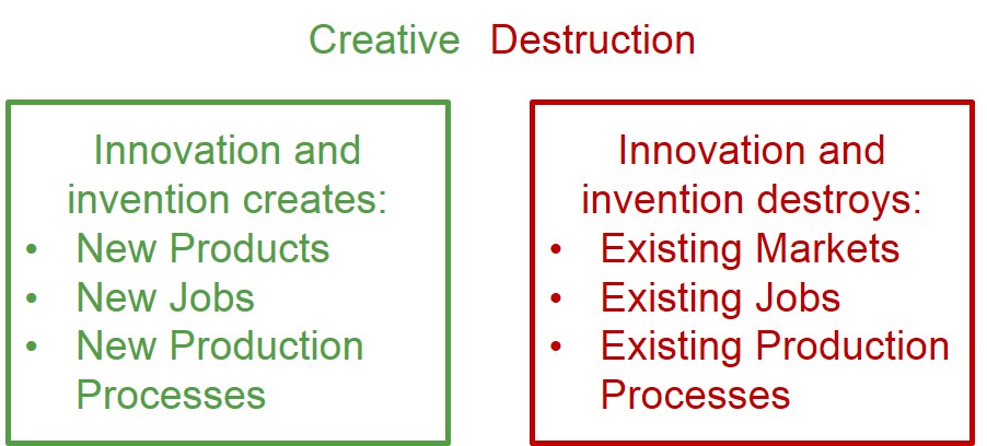 Below is an illustration of what creative innovation and invention leads to but also how it can offet these effects by destroying some exisintg markets and jobs that go with it. A modern example of this is the Uber taxi service putting pressure on traditional taxi service companies in the largest cities in the world.