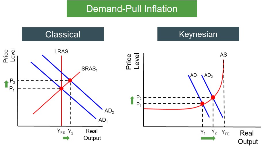 Below is a set of diagrams to highlight the two different approaches to showing demand-pull inflation in an economy. The Keynesian AS curve provides a clearer path to evaluating the impact of demand curve shifts on the inflation rate. In the classical case, the inflation is created by an outward AD shift with no change in the SRAS curve assuming ceteris paribus.