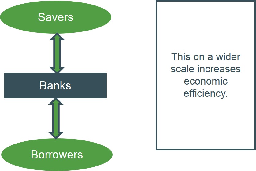 Below is a diagram which highlights how banks act as an intermediary of funds between surplus units (total income exceeds total expenditure) and deficit units (total income exceeded by total expenditure). This is done by taking depostis from these savers and transferring them to borrowers through loans.
