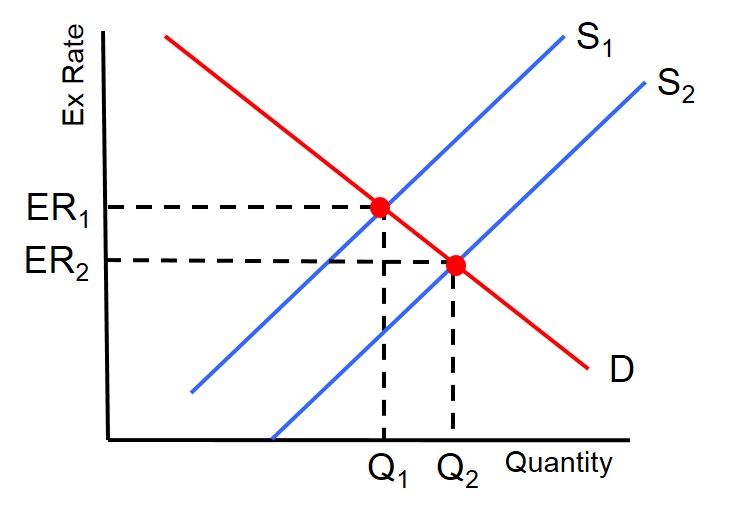 A fall in the value (Exchange Rate) of a currency due to excess supply. This will result in lower export prices and higher import prices.