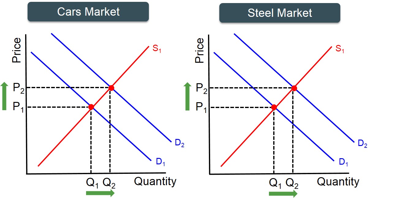 Below is a set of diagrams to illustrate derived demand in a demand and supply framework. If there is an increase in demand for cars, then ultimately more cars need to be produced to meet the extra demand. However, more cars can only be made if more steel is made. So therefore similtaneously an increase in demand for cars will lead to an increase in demand for steel, as steel has demand derived from cars.