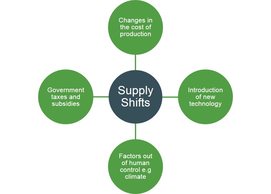 Below is a list of factors that will cause the supply of a given product to change. If the costs of production change this will change the supply because it will ultimately affect the cost at which firms can produce products at and therefore their profit margins will be affected. New technology being introduced can increase the producitvity and efficiency of the production process and this can lead to an increase in supply at a given price. Goevernment taxes and subsidies can affect the overall cost of producing a good. For instance if a subsidy is granted to a firm it will encourage them to produce more as it is now cheaper to produce. Finally external factors such as the change in climate can affect the amount of goods that can be produced particuarly in the agricultural market (primary sector).