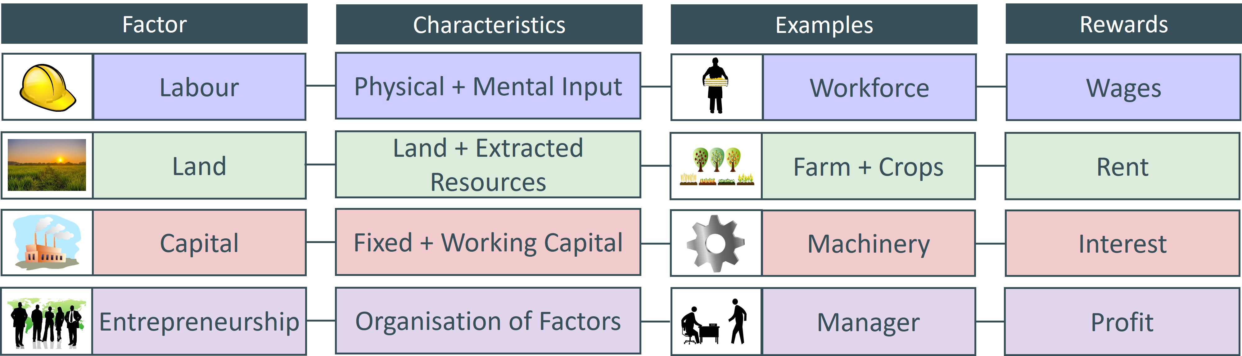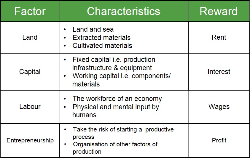 The inputs that are used in the production process to facilitate the production of the goods and services which contribute to an economy's GDP. An input can be classified as either labour, capital, land or enterprise, depending on the function that the input serves in the production process. A summary of the main characteristics of the four factors of production are highlighted in the table below.