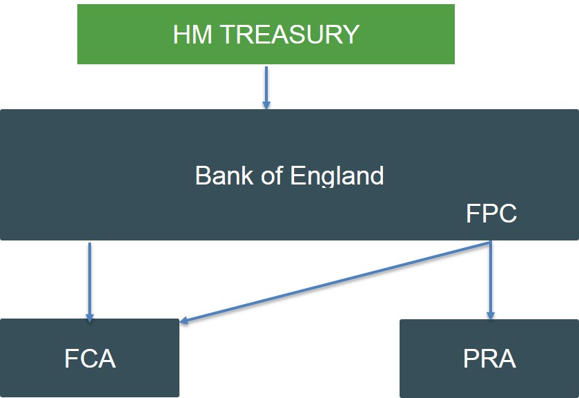 Below represents the current 'twin peaks' regulatory structure of the financial sector with the FCA being a subsidary of the Bank of England.