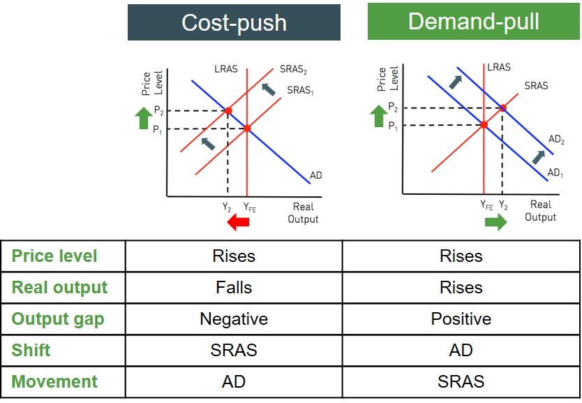 The diagrams below illustrate the two main types of inflationary pressures caused by the persistence of an output gap. The left-hand side diagram represents cost push inflation and the right-hand side diagram represents demand pull inflation.