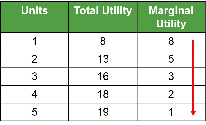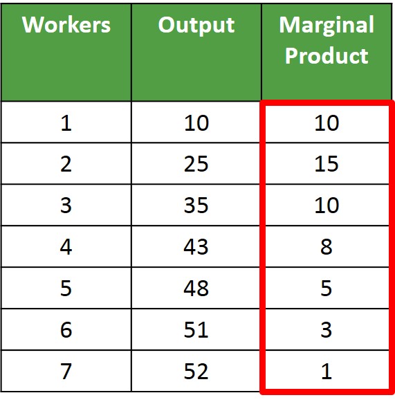 Below is an example of how the law of diminishing marginal returns can be illustrated both graphically and numerically. The marginal product is positive for each additional worker, which emphasises that each worker is contributing to the level of output for the firm. But this marginal product starts increasing at a decreasing rate after worker 2. This does not mean that any workers employed after worker 2 is less productive and less efficient but just that the conditions in the workplace for this firm to absorb extra workers without additional capital and infrastructure is restricting the amount of output future workers can make. For instance, if a bakery shop keeps employing new bakers without increasing the number of ovens available for bakers to use will mean that the value of each additional baker hired in terms of output will be lower, as each of the bakers are having to queue up to use each of the ovens.