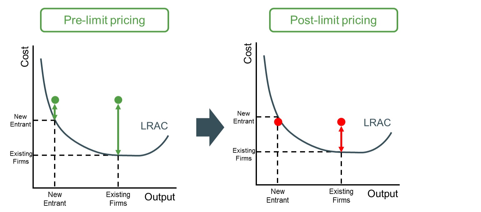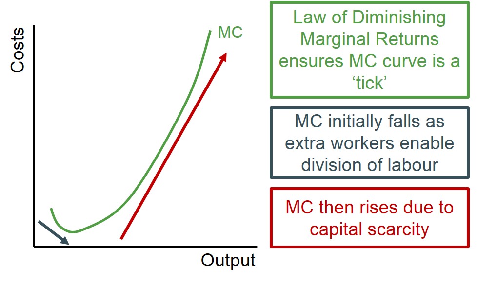 Therefore, given that this law exists this causes the marginal cost curve to have the shape that it has below. This is because the marginal product is rising for the first extra workers hired and therefore the marginal cost is low. But as the marginal product belonging to each worker begins to fall the marginal cost begins to rise as the firm moves closer and closer towards full capacity.