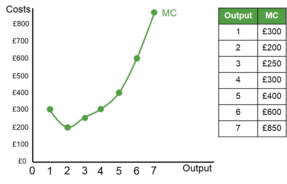Below depicts an example of a firm's marginal costs associated with different levels of output produced. The marginal cost curve has a 'tick' shape because for small levels of output the marginal cost falls due to exploiting productivities and efficiencies. But as output becomes too large, production costs start to escalate and this explains why very sharply for high levels of output the marginal cost curve rises.