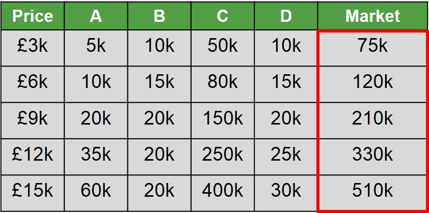 Below is an example of how to derive the market supply curve. At every individual price, it needs to be calculated how many firms are willing to produce/supply a certain amount of goods. This is shown in the table below.