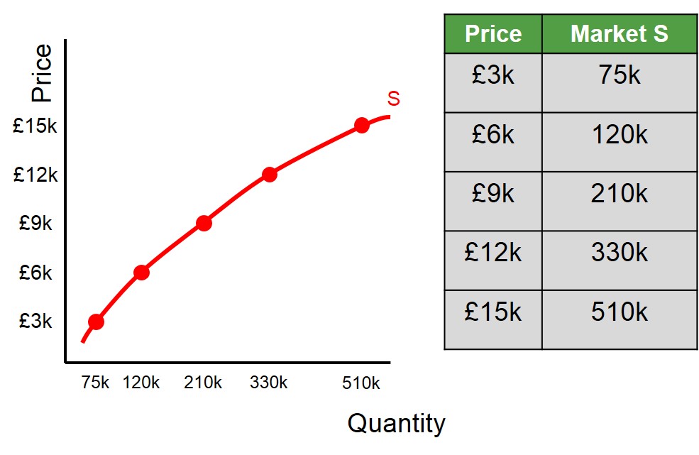 Below is the illustration of the market supply curve using the data in the table. As can be seen from the graph, the supply curve for the market has the same basic upward-sloping shape as the individual firm supply curve, to signify that the market will always be willing to supply more goods the higher the price is. This is because of the profit incentive associated with bigger margins.