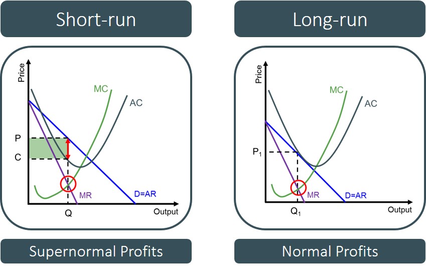 In the case of supernormal profits being made in the short-run, this is eliminated in the long-run because firms outside of the market are incentivised to join and produce because of the attraction of jointly earning supernormal profits. However, as there are only a limited amount of customers in the market, the greater the number of firms in the market, the more diluted the customer base for each incumbent firm becomes. This as a result causes the demand curve and marginal revenue curves to shift inwards, until only normal profits are earned by all firms in the market in the long-run.