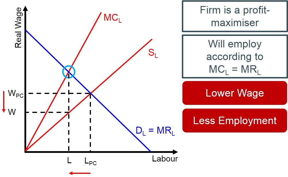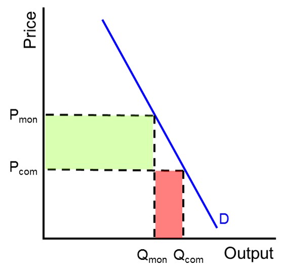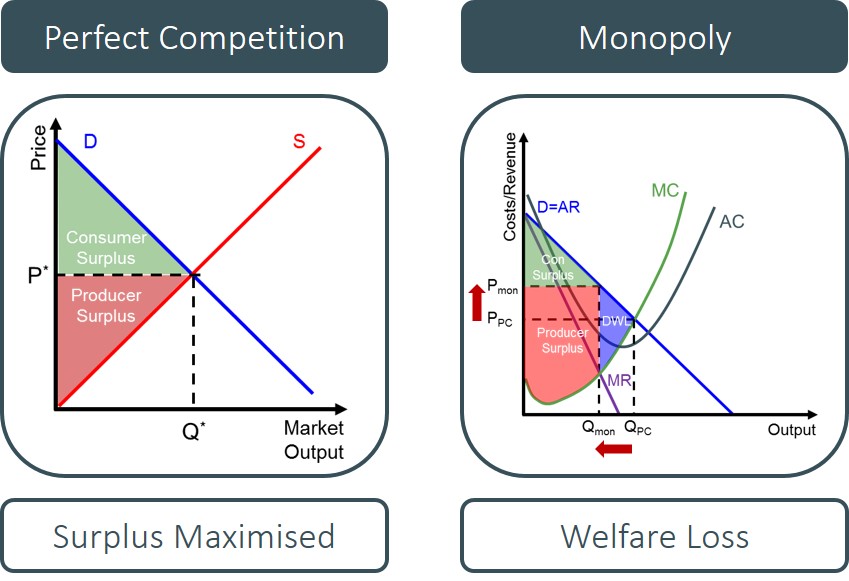 First of all, productive efficiency is not achieved under this type of market structure as firms do not produce at the minimum of the average cost curve. This is the case in both the short-run and long-run as firms produce at a higher cost when maximising profits. This leads to efficiency and welfare losses that are achieved under a perfectly competitive market structure.