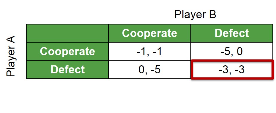 Below is a 2x2 payoff matrix and the equilibrium concept to this game. In this instance both players are playing their best response at (Defect, Defect). For more information on this game and how it's solved see the Prisoners' Dilemma Game.