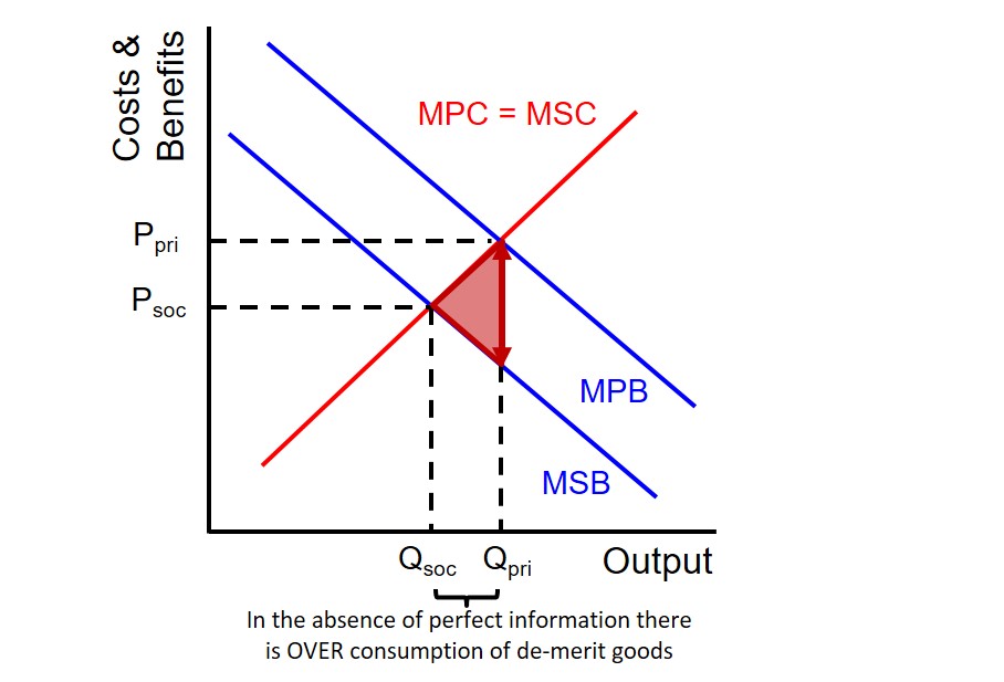 This is because the over-consumption creates a divergence between the marginal private benefit and the marginal social benefit curves. This is because consumers do not take into account the negative effects on society of consuming this good e.g. second hand smoke when smoking a cigarette. The external cost that is released onto society is represented by the dead weight loss triangle below.