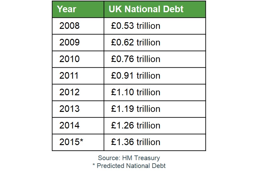 Below is a table to show the level of UK national debt that has been accumlated as the government has been running a large budget deficit.
