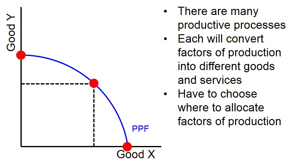 The diagram below shows the basic shape of a country's PPF, illustrating the the distribution and allocation of resources towards producing goods to help the economy achieve the full employment level of output. Any point on the PPF is a point that is pareto optimal, productively and allocatively efficient due to the utilisation of all the factors of prodcution in the economy.