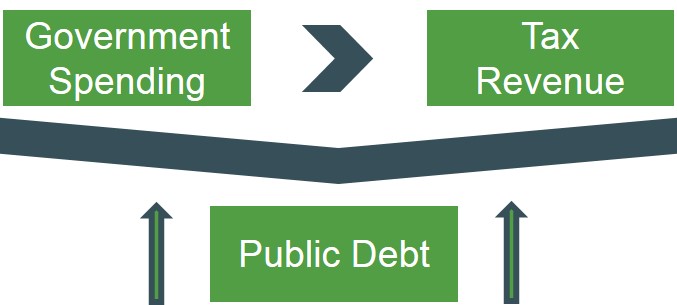 Below is a graphic to show that if the government runs up a significant budget deficit then it accumlates the level of public national debt for a country. This is why government's are under pressure to not consistently run a budget deficit, so that the burden of debt can be be shaved off. As the more indebted a country becomes the lower their creditworthiness is i.e. credit rating deterioriates.