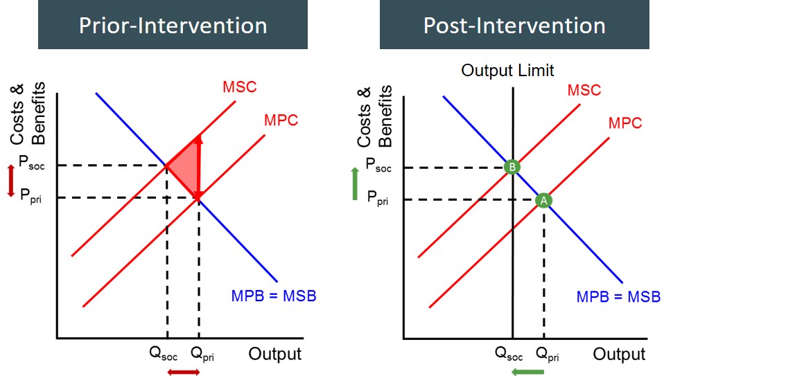 As a result of a negative production externality being produced, output needs to be reduced via regulation. The output limit is set at Qsoc to maximise social welfare.