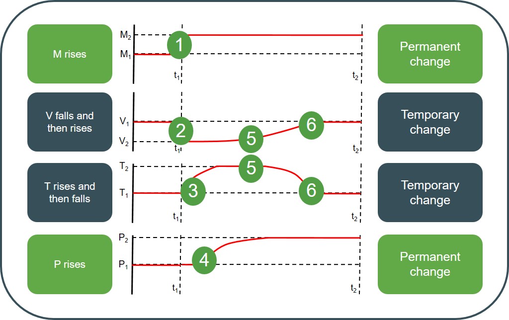 At period t1 the initial increase in the money supply causes the amount of money circulating in the economy to permanently increase from M1 to M2. This immediately causes the velocity of circulation to fall by an equal factor (V1 to V2) temporarily as each unit of currency does not change hands as many times within a year now there is more money circulating around. However, as the extra money begins to be spent by consumers the number of transactions (T) in the economy starts to gradually rise over time and this creates pressure for price level to rise over time (P) as a result of demand-pull inflation. As a result of more transactions being conducted in the economy, this starts to cause the velocity of circulation to rise over time as consumers make more transactions. But, as the price level rises this causes the number of transactions to fall back to its original level, which also means V also falls back to its original level, as consumer real incomes start to fall back to their original levels. So at the final equilibrium there is a higher price level with the same values for V and T.