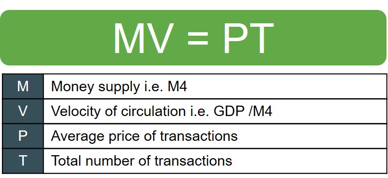 Now there are a few assumptions that monetarists impose on the equation in order for the theory and the subsequent results to hold. The most important of these assumptions is that T and V are always assumed to be constant values in the short-run at least. Monetarists particularly stress V is held constant because the demand for money is a function of income and this does not immediately change in the short-run from a change in M. Based on this assumption the equation cancels down to: