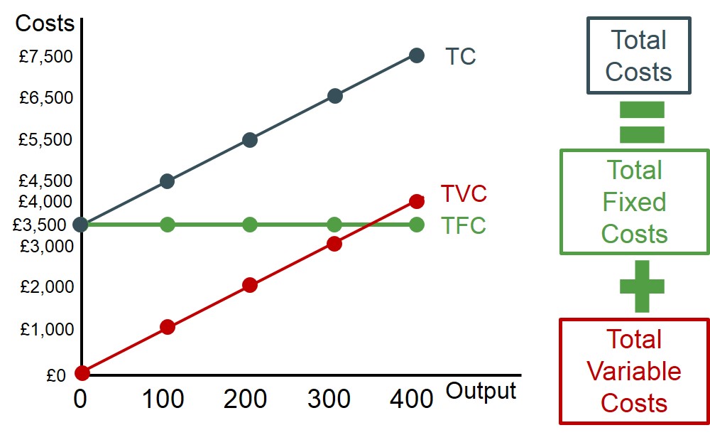Below is a diagram to show that the total cost curve is derived from the total variable cost curve and total fixed cost curve. As these are sepearate costs that face the firm, if at each output level both of these costs are added up the total cost for each level of output can be calculated and by connectng all of these points together the total cost curve can be derived, as shown below.