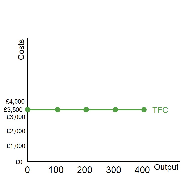 Below is a diagram to show an example of a total fixed costs curve for an individual firm. As can be seen this curve is perfectly horizontal because these costs do not change regardless of how much output is produced and therefore this line will indefinitely continue until the firm either has a reduction or increase in the amount of fixed payments such as rent on a building.