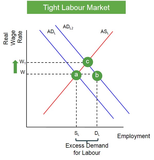 Below is a depiction of what happens in the labour market of an economy that is close to full employment. Once an economy aproaches full employment more output needs to be made in order to meet ever-increasing demand for products. However, if the economy is close to full employment extra labour cannot be hired easily as the pool of available workers is small. Therefore the aggregate demand for labour curve shifts to the right as firms would like to employ more workers but the supply is not available. Ultimately this excess demand causes existing workers wages to steadily rise as workers now hold higher bargaining power. This is shown in the diagram by moving to point C at a higher wage rate of W1 to cancel out the excess demand for labour.