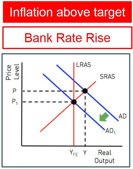Below is a diagram to show when there is unsustainable growth and runaway inflation, a cut in the bank rate will contract the aggregate demand curve in order to restore full employment and ensure the target CPI inflation rate is met.