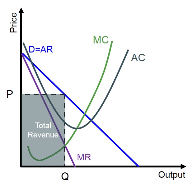 Below is a diagram to show the level of revenue that a monopolistic firm makes. As can be seen this blue shaded region is equal to the market price multiplied by the quantity of goods produced. The level of sales revenue in this instance is quite large as the monpolist has significant market power and can charge a price above the marginal cost curve.