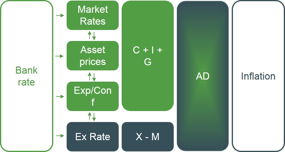 A model that explains the impact of monetary policy on an economy. Below is a simplified version of the transmission mechanism to identify the main channels in which a change in the base rate ultimately affects the economy.